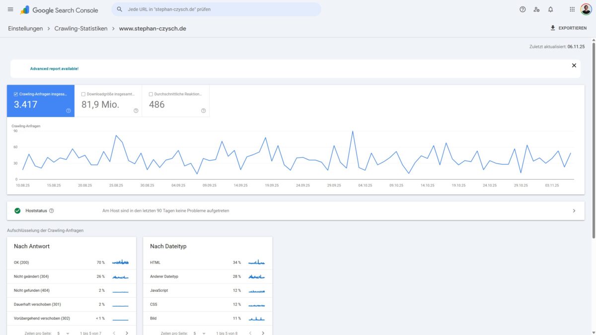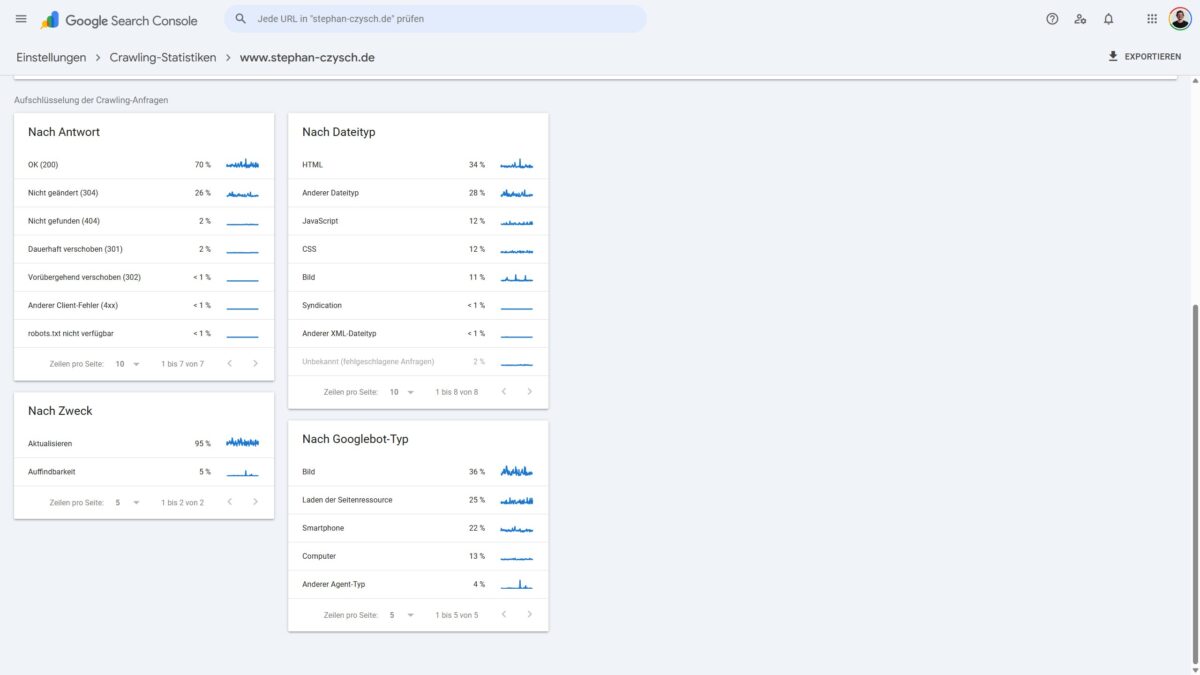 Welche Subberichte zur Verfügung stehen, ist von Website zu Website unterschiedlich. So ist z.B. der Bericht nach Statuscode „Nicht geändert (304)“ nur dann verfügbar, wenn es gecrawlte URLs gibt, die diesen Statuscode liefern. Eine Auflistung der möglichen Teilberichte gibt es in der Google-Hilfe.